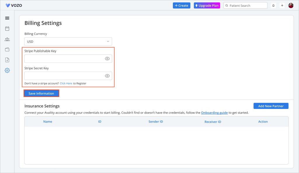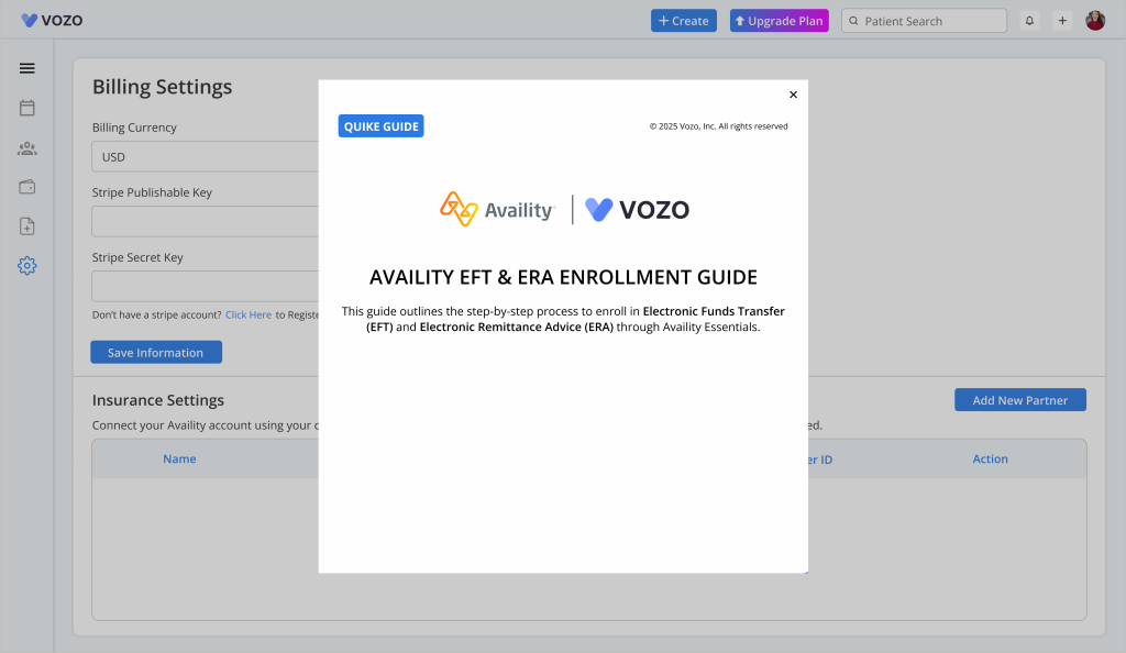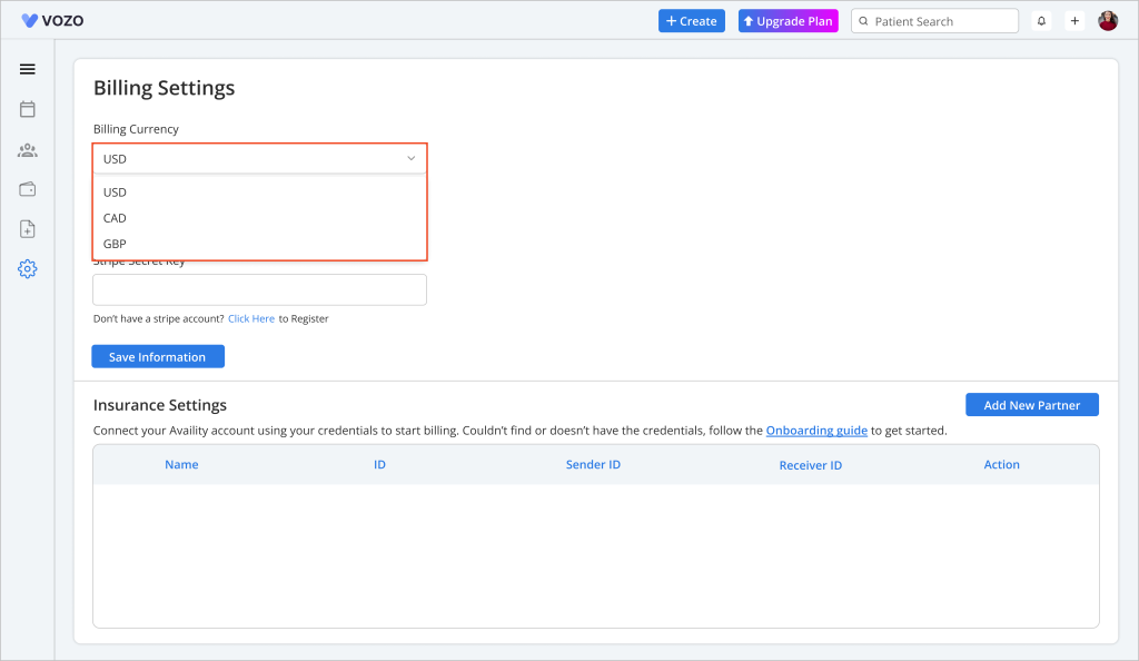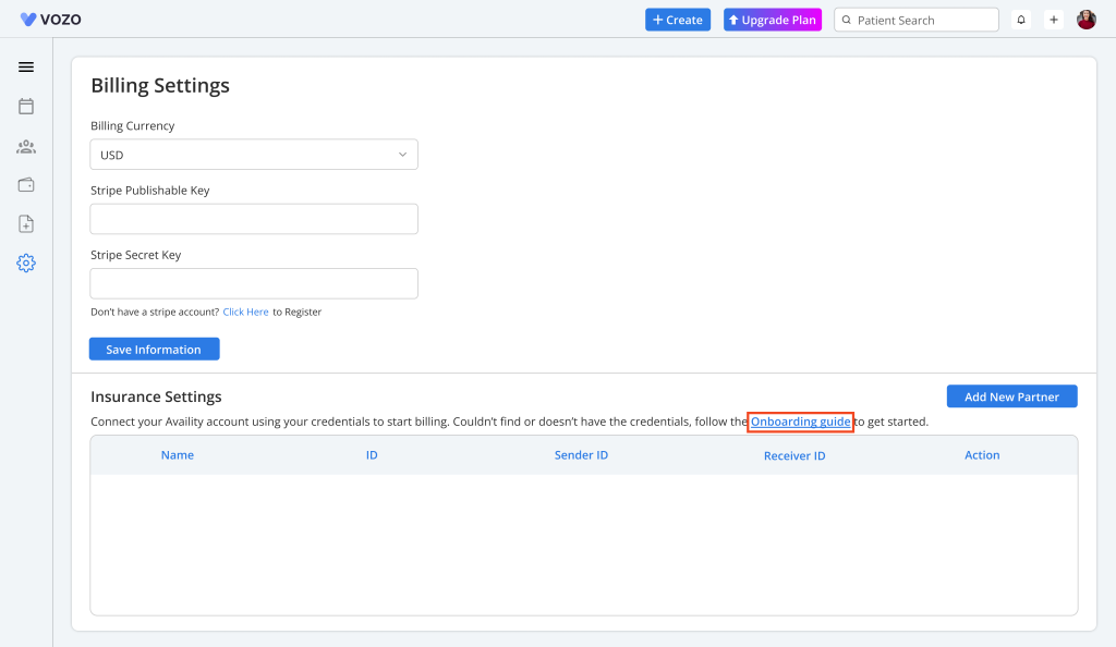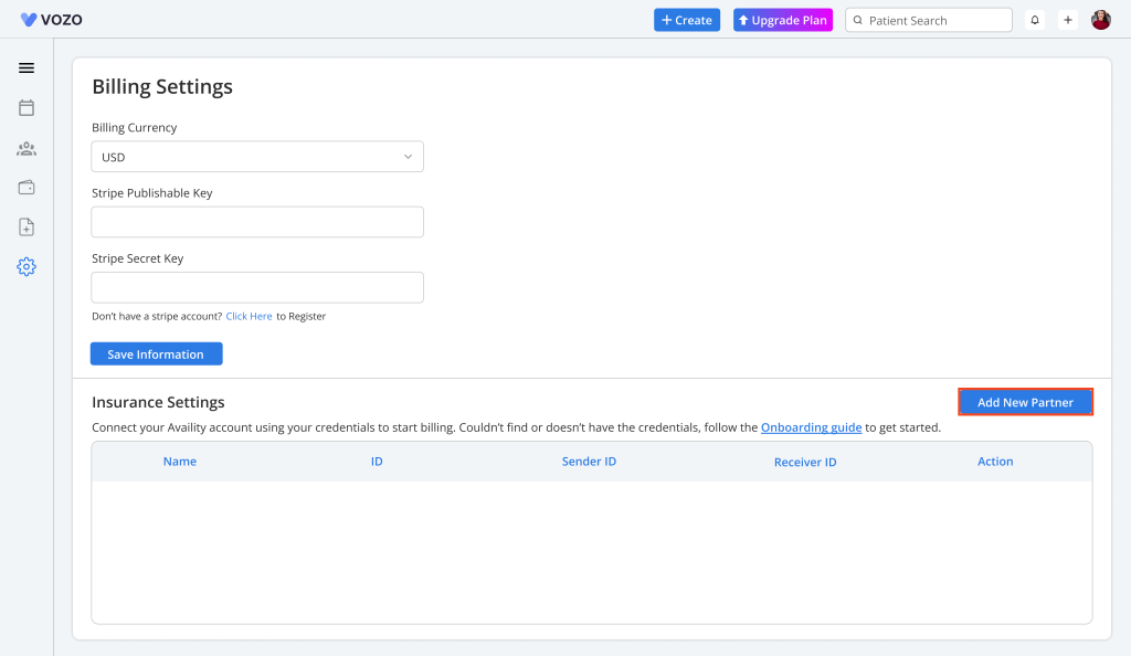 1. In the Insurance Settings section, configure your third-party Availity clearinghouse or other clearinghouse integration.
