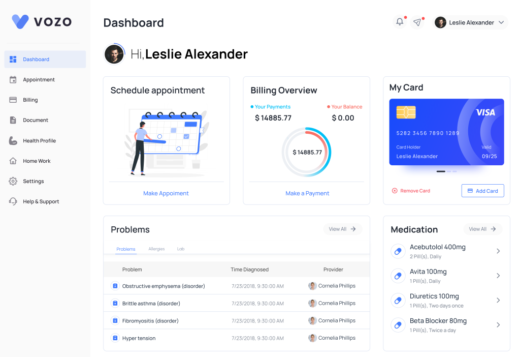 - Once the User logins he lands in a dashboard page where he can schedule an appointment, have billing overview, view added cards, problems, allergies, lab and medication.