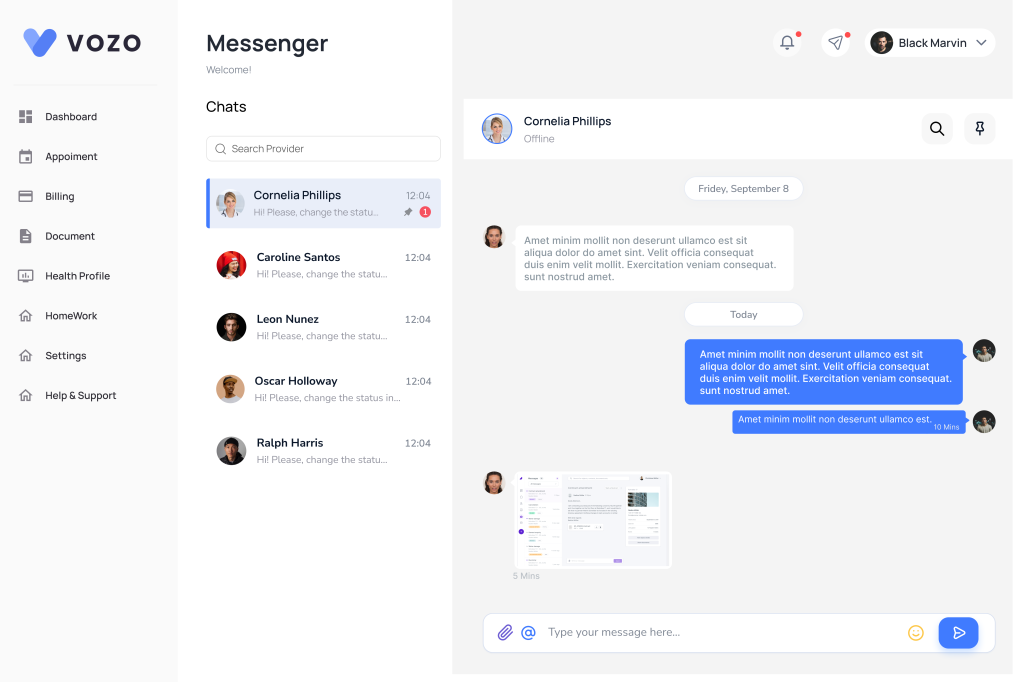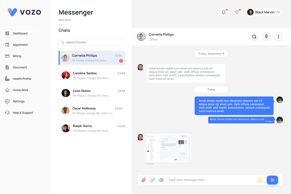 - In the messenger screen we can see the list of providers we have chatted with in the past. To search for a specific provider chat search using the provider’s name in the search bar.