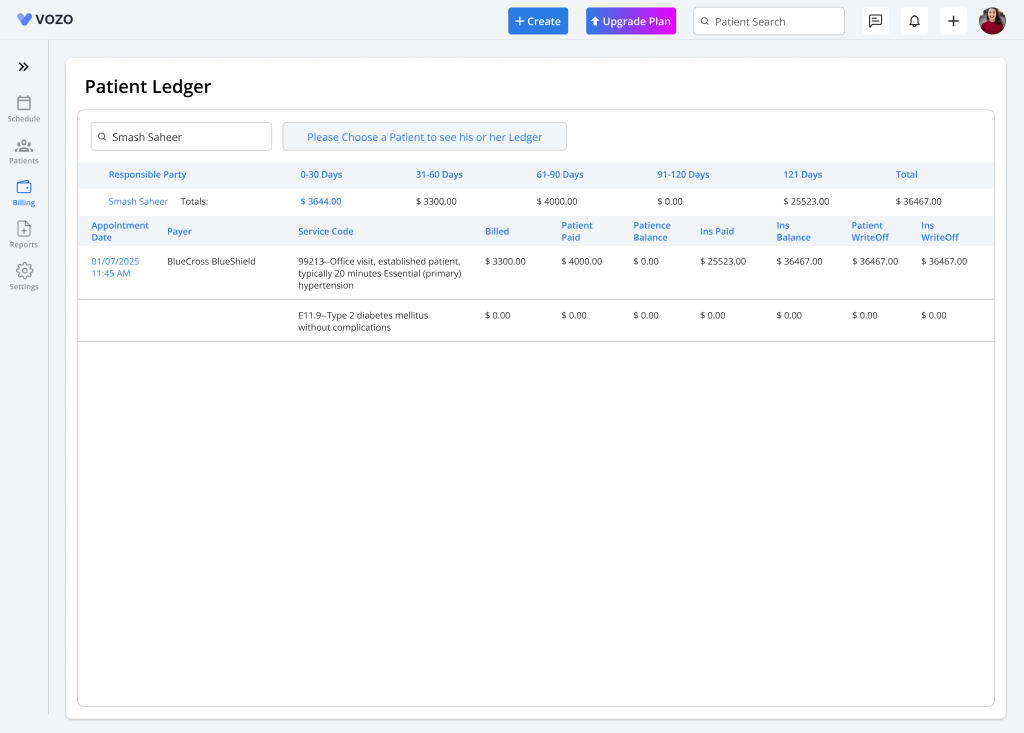 - The “Patient Ledger” lists the outstanding balances to be paid by the patient for all the appointments based on a 30-day interval cycle (0–30, 31–60, etc).