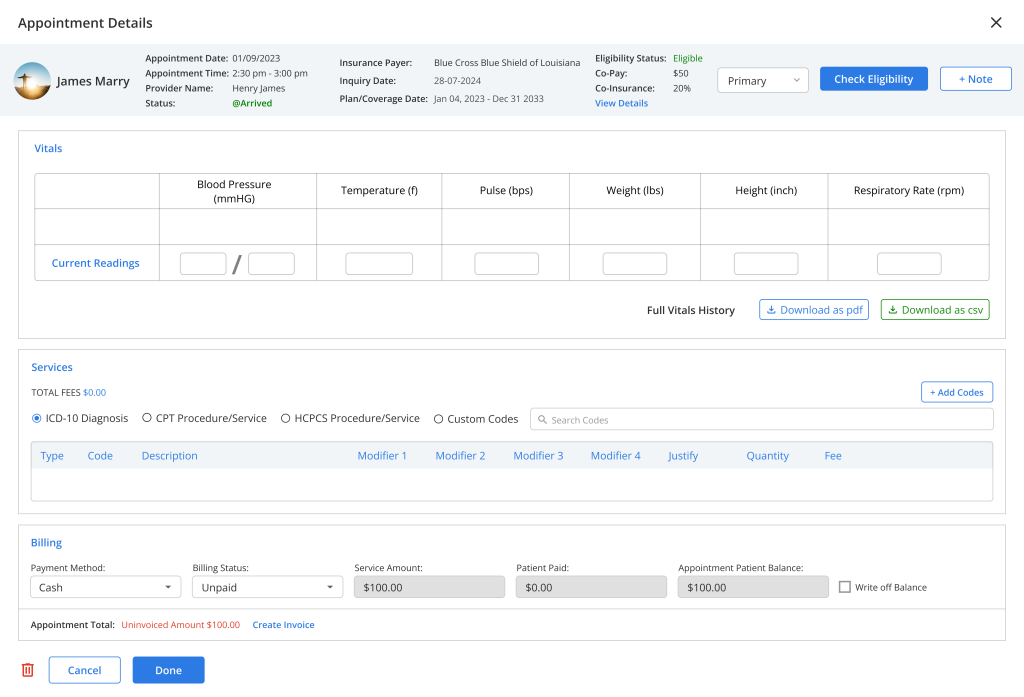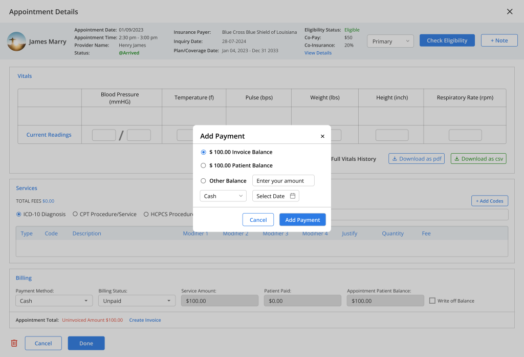 2. Once the services and fee amount have been added, select a payment method from the dropdown (Cash or Insurance) in which the appointment is going to be billed.